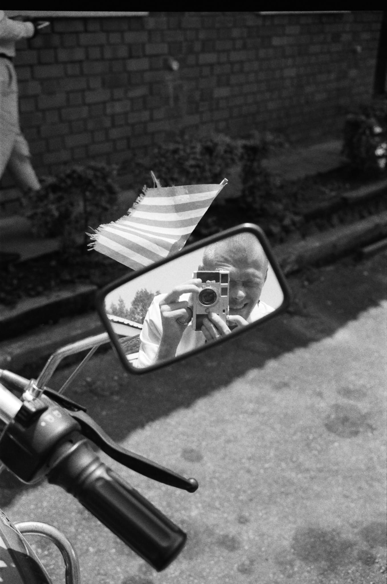 In the lot, a motorbike stood with two small U.S. flags fixed to its handlebars.