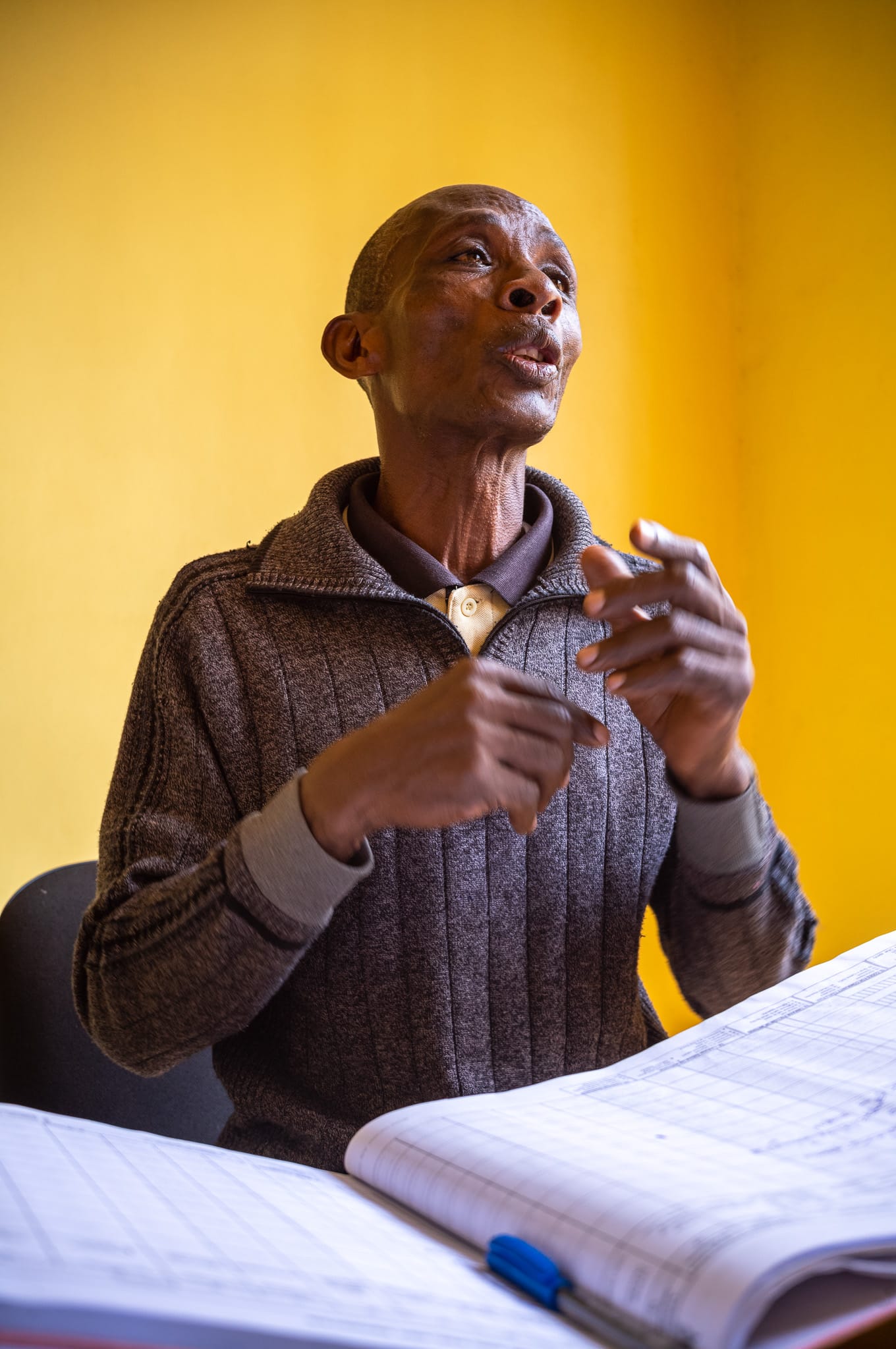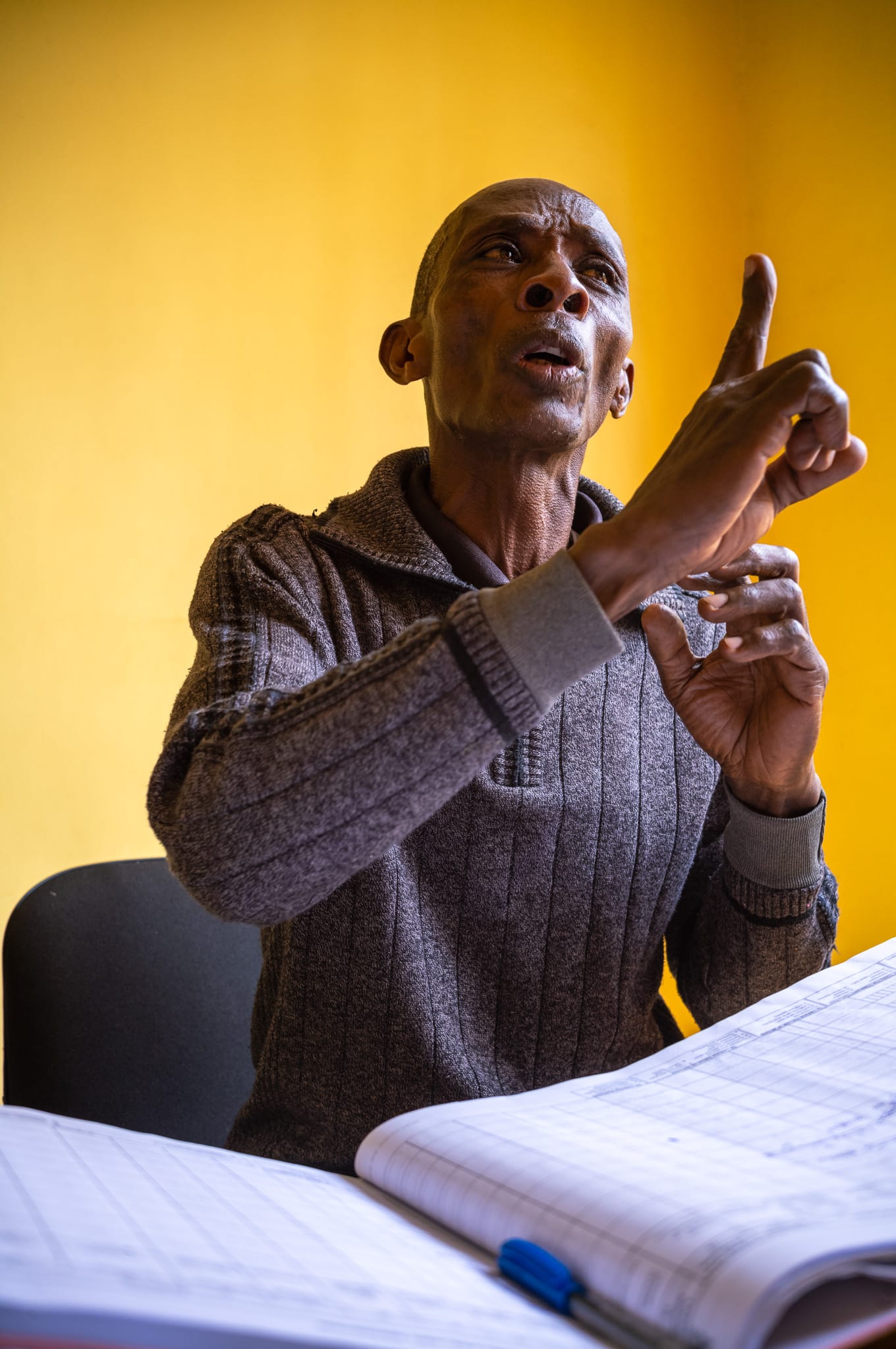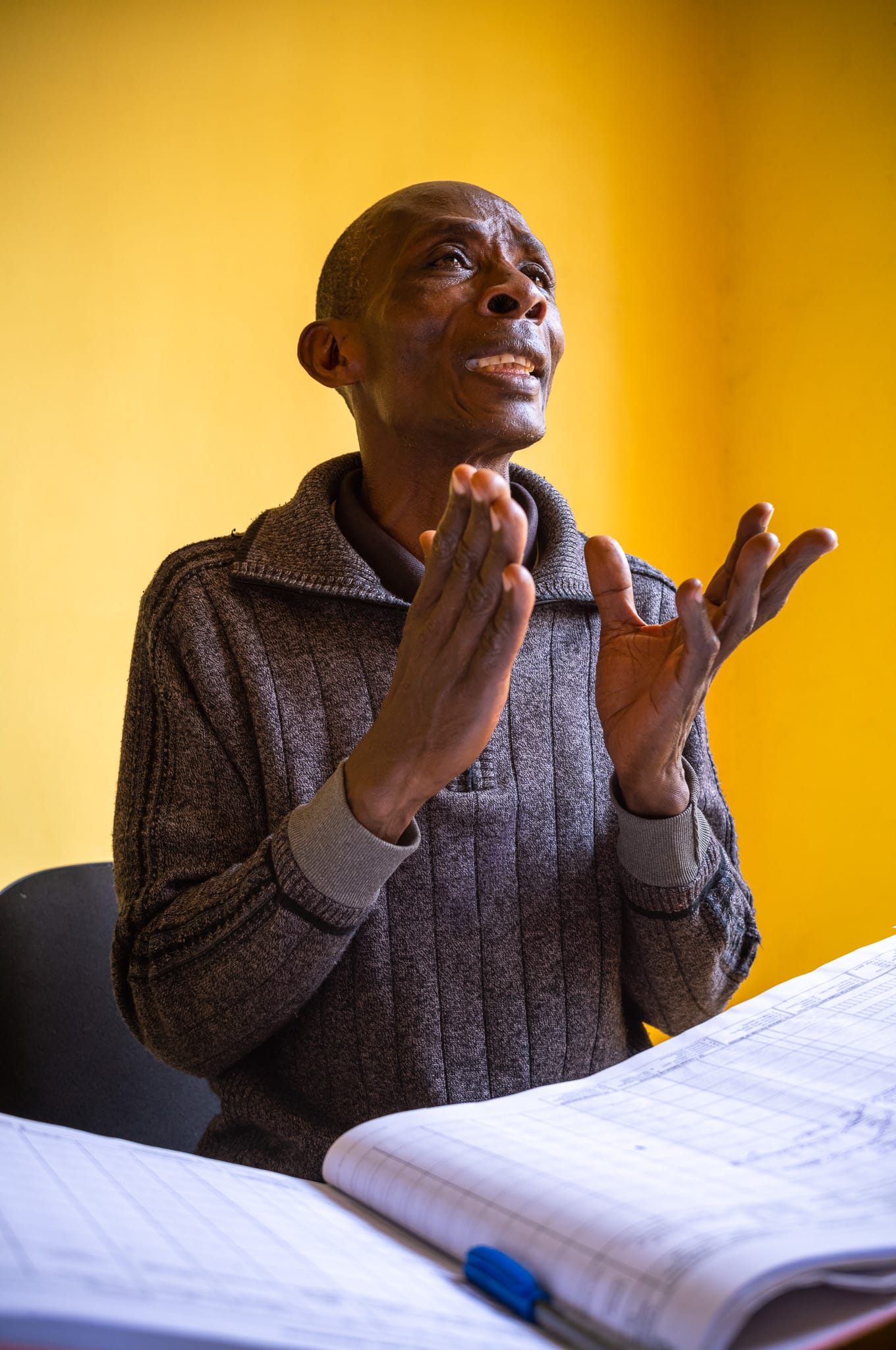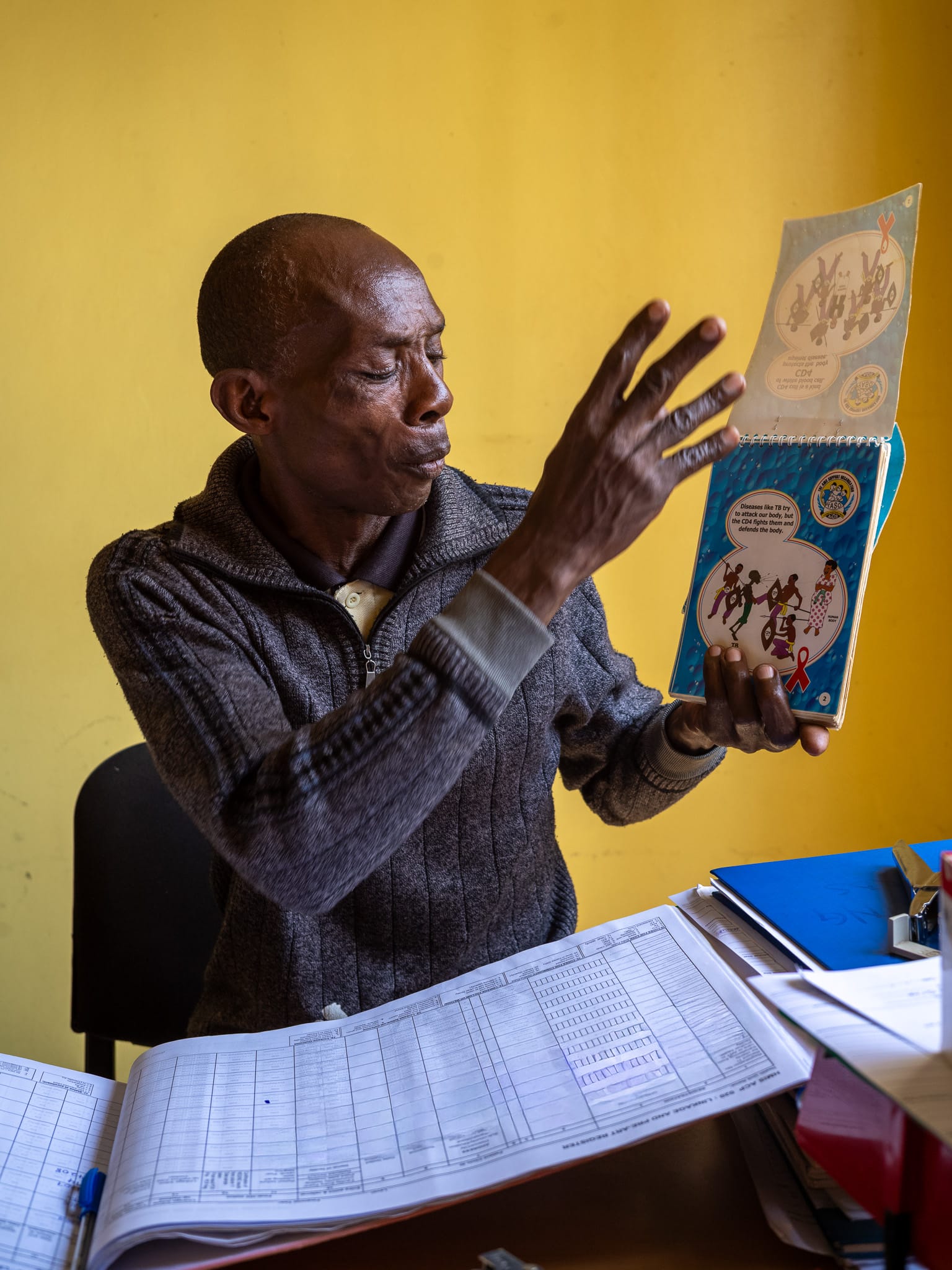As I left the clinic that afternoon, I kept thinking about that yellow counseling room when time stopped. As Robert explained his work, the sun climbed higher and the room grew warm. Mid-sentence, he paused and pulled off his sweater. In that moment, I pressed the shutter. The frame caught him mid-movement.
