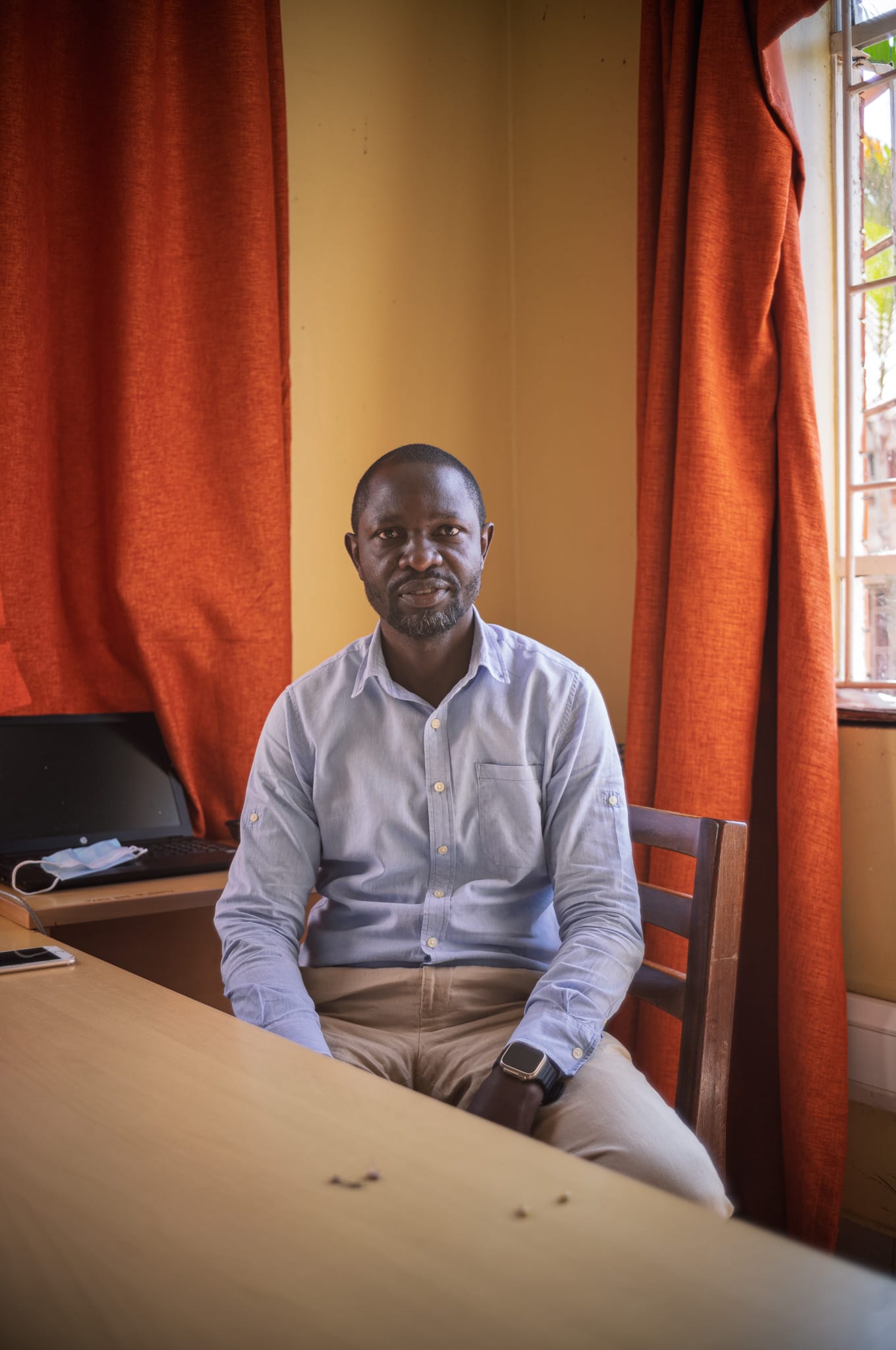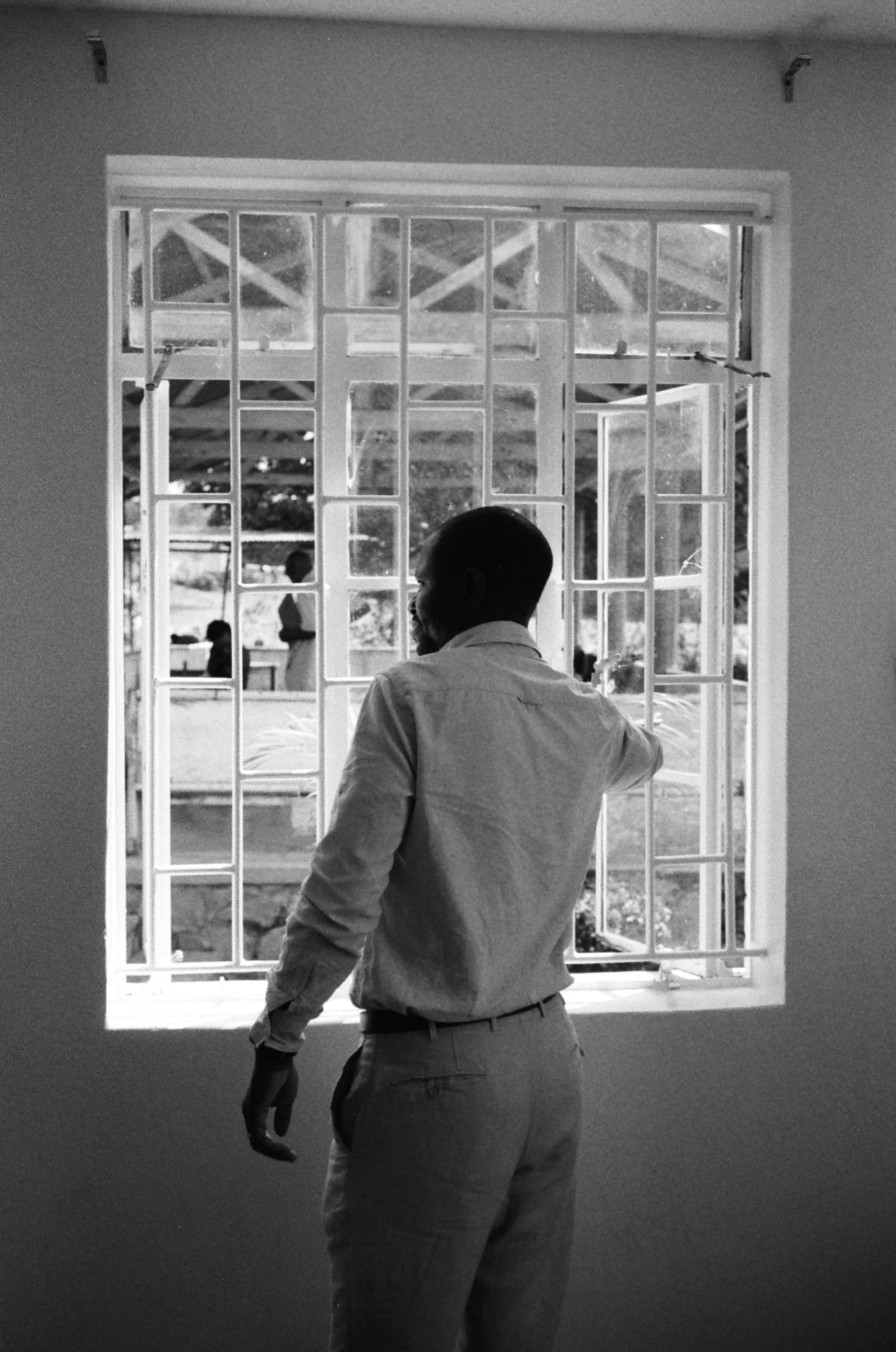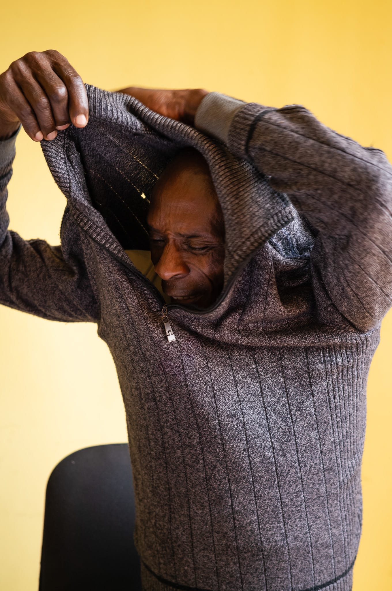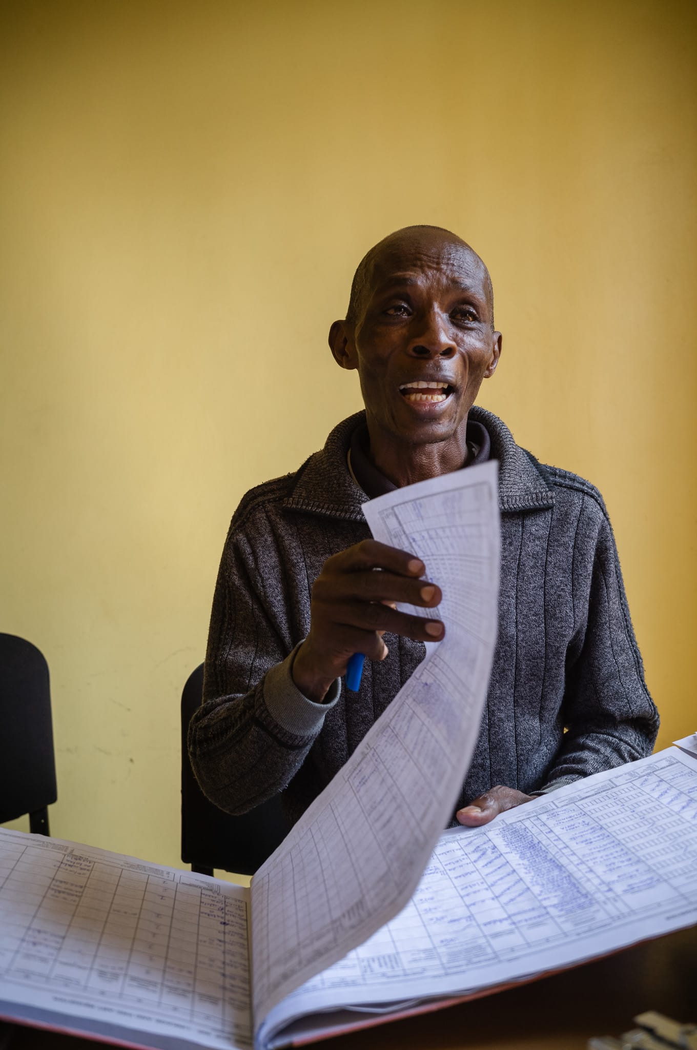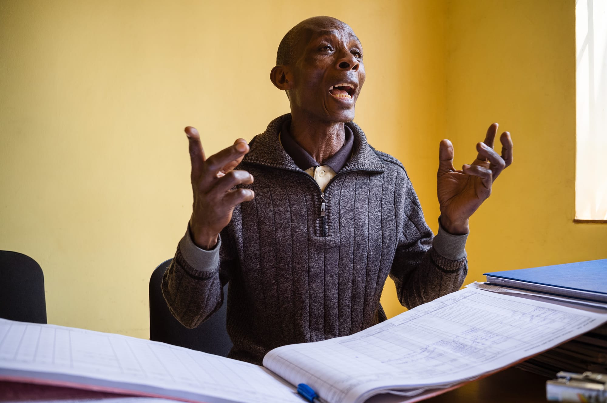 As I left the clinic that afternoon, I kept thinking about that yellow counseling room when time stopped. As Robert explained his work, the sun climbed higher and the room grew warm. Mid-sentence, he paused and pulled off his sweater. In that moment, I pressed the shutter. The frame caught him mid-movement.