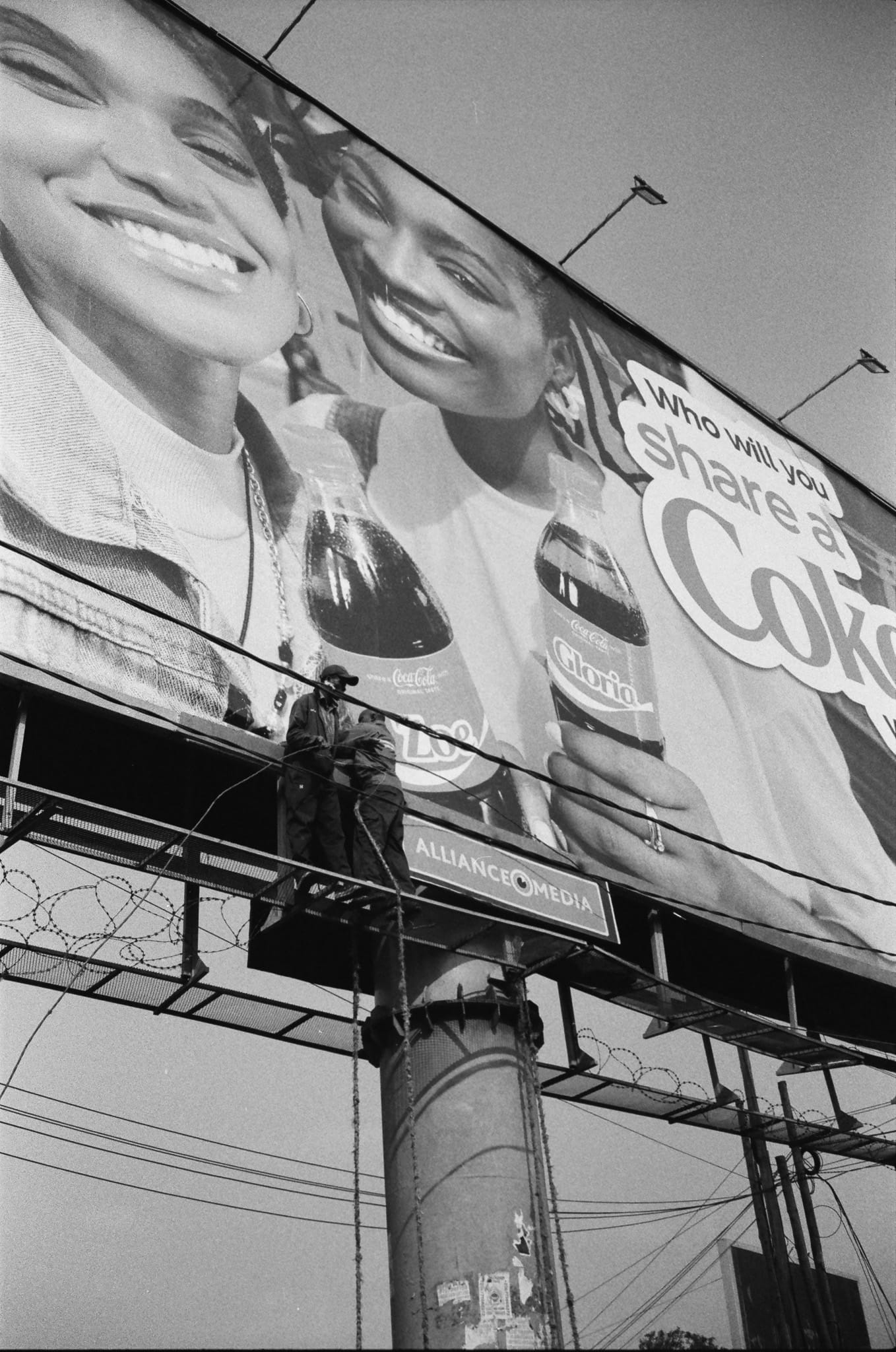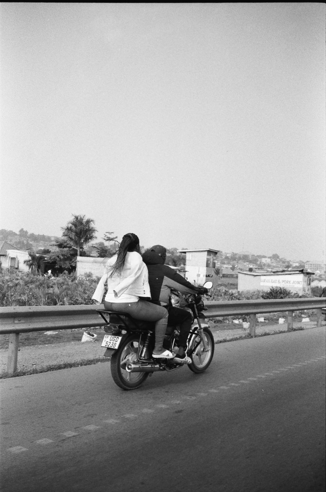 Street scenes in Kampala traffic including men working on a Coke-a-Cola billboard (left), a boda boda driver (center), and Louis at the Mulago Referral Hospital (right) on 30 July 2025. Analog 35mm photos by Ben Eveslage.