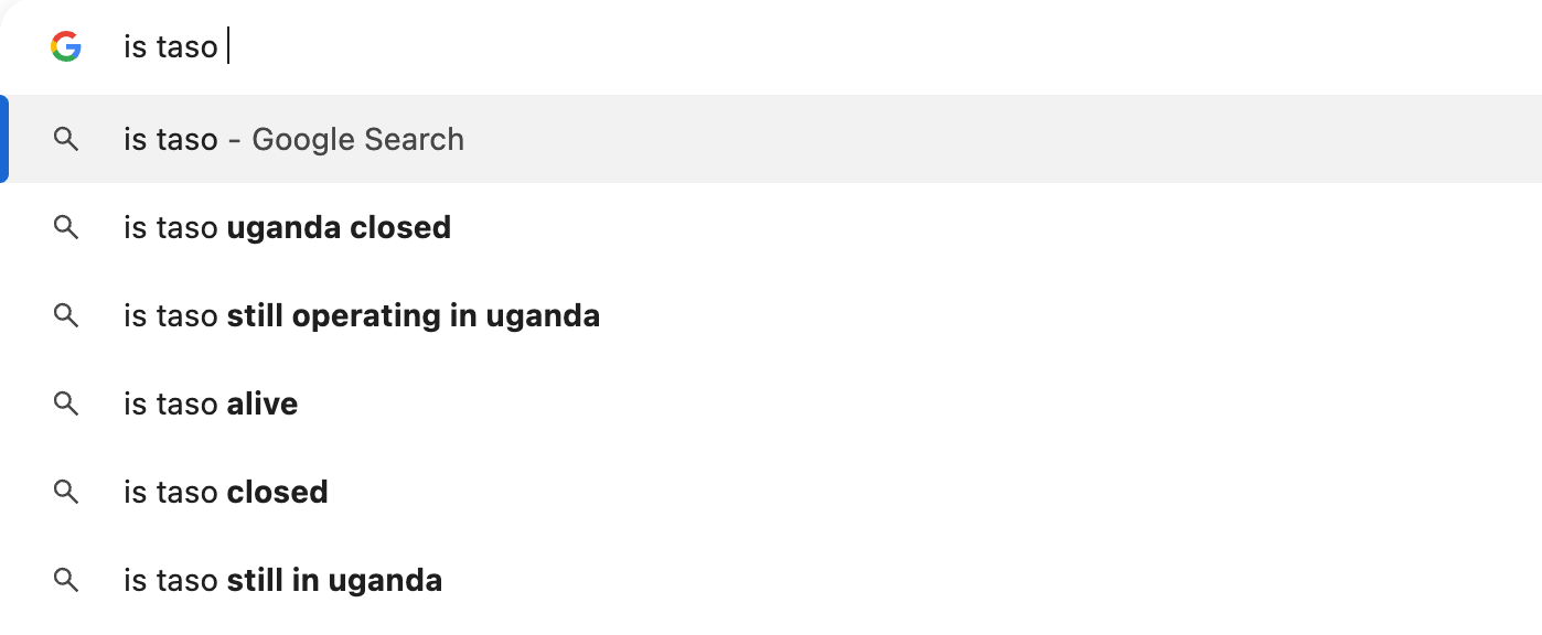 TASO’s clients know this. When U.S. government stop-work orders suspended much of the organization’s funding in January 2025, fear spread quickly. Many assumed TASO would close. Even now, as I write in December 2025, Google’s top autocomplete results for “Is TASO…” include closed, still operating, and alive?
